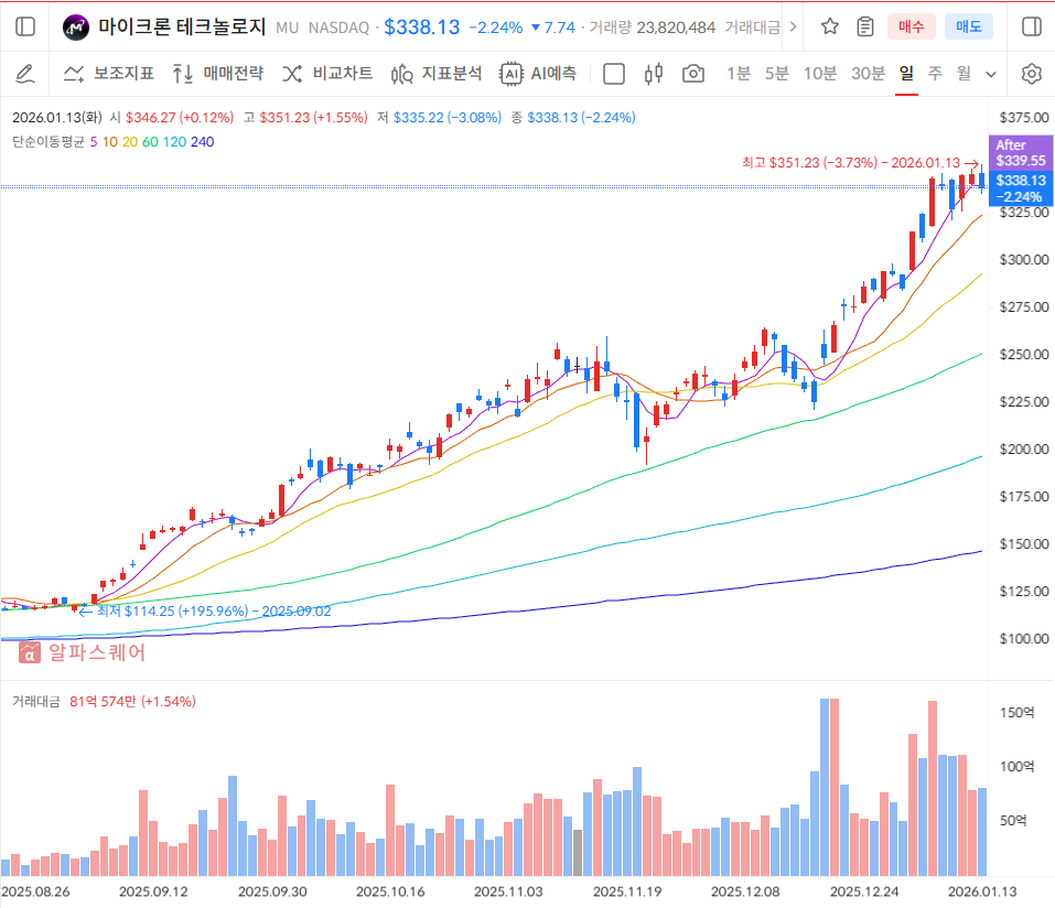 차트를 보면 현재 마이크론 주가는 장기 이평선인 200일선과 단기 이평선인 50일선 위에서 견고한 정배열 흐름을 유지하고 있습니다. 전형적인 강세장의 패턴이죠.