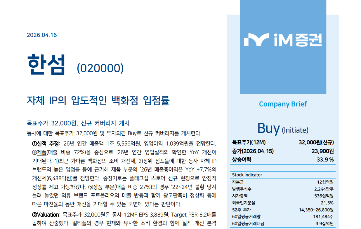 결론은 분명하다. 한섬 은 단순한 경기 민감 소비주가 아니다. 백화점 상위 점포 지배력, 자체 IP 중심의 높은 제품 비중, 그리고 소비 회복기에 나타나는 이익 레버리지까지 갖춘 드문 구조다. 2026년은 이 구조가 숫자로 증명되기 시작하는 해이고, 지금 주가는 그 변화를 충분히 반영했다고 보기 어렵다. 따라서 한섬은 “내수가 좋아지면 오르는 종목”이 아니라, “좋은 내수 구간에서 실적이 가장 효율적으로 개선되는 종목”이라는 관점으로 접근하는 편이 맞다.