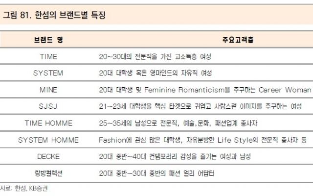패션업은 같은 소비 회복 국면에서도 브랜드별 실적 차이가 크게 벌어진다. 이유는 간단하다. 수요가 먼저 몰리는 매장, 먼저 팔리는 브랜드, 정가 판매가 가능한 브랜드가 따로 있기 때문이다. 한섬은 백화점 중심의 프리미엄 포지션을 오랫동안 유지했고, TIME, MINE, SYSTEM, TIME HOMME, SYSTEM HOMME 같은 브랜드를 통해 소비자 충성도를 쌓아 왔다. 여기에 상품 브랜드인 DKNY, 타미힐피거, 클럽모나코 등도 상위 점포 입점률이 높다. 회복 국면에서 브랜드 노출이 부족해 매출을 놓치는 구조가 아니라, 이미 가장 좋은 채널에서 고객을 맞을 준비가 끝난 구조라는 뜻이다.