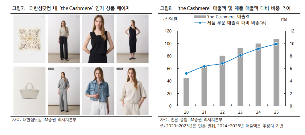 한섬의 투자 논리를 숫자로 확인할 수 있는 사례가 `the Cashmere`다. 이 브랜드는 최근 연매출 1,000억원을 돌파한 것으로 추정되며, 최근 5년 CAGR이 19.2% 수준으로 제시된다. 더 중요한 것은 이 브랜드가 백화점 상위 20개 점포 중 19개에 입점해 있다는 점이다. 브랜드 역사 자체는 길지 않지만, 핵심 점포 진입과 고가 포지셔닝을 통해 빠르게 메가 브랜드가 됐다는 사실이 확인된다.