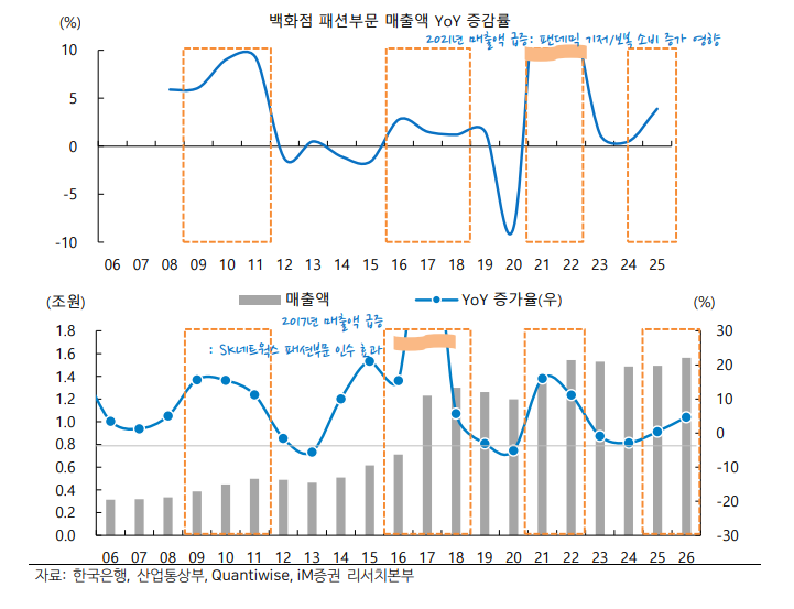 리포트에서 반복적으로 등장하는 표현이 “압도적인 백화점 입지”인데, 이것을 투자 관점으로 번역하면 결국 두 가지다. 첫째, 같은 매출 증가라도 경쟁사보다 매출총이익으로 더 잘 전환된다. 둘째, 업황 반등기에 판매관리비 증가보다 총이익 증가 속도가 더 빨라진다. 실제로 2025년 전체 GPM이 56.3%인데 2026년에는 58.5%로 개선될 것으로 예상된다. 영업이익률도 3.5%에서 6.7%로 올라간다. 패션업에서 마진이 3%포인트 넘게 오르는 것은 결코 작은 변화가 아니다. 물량 증가보다 훨씬 큰 이익 레버리지 효과가 난다는 뜻이다.