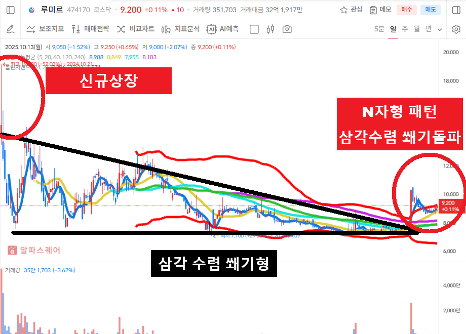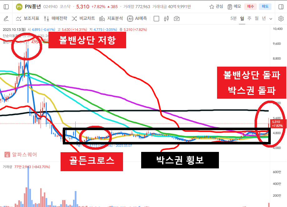 ■ 에셋마스터의 [1] 돌고래차트는 매매기준. - 60일선을 이탈하고 급격하게 하락하던 주가가(가격조정,기간조정) 하락을 멈추고 캔들이 5일선을 돌파 후 안착하고, 5일선은 20일선을 골든크로스 해주어야 합니다. 다음날 혹은 그다음 날 5일선 지지선에서 매수 걸고 기다리는데, 이때 60일선 이탈 이후 급격한 하락은 신뢰도가 높습니다. - 참고, 20일선 이탈 시 손절잡고 진행하는 기준입니다. #돌고래차트 #주식투자 #주식공부 #주식공부방 ■ 에셋마스터의 [2] 볼린져밴드 돌고래차트 매매기준. 볼린져밴드 기간을 69로 설정하고, 캔들이 설정한 볼린져밴드 상단선을 돌파해 주어야 합니다. 이때 5일선이 볼린져밴드 상단선을 골든크로스 해주어야 신뢰도가 높습니다. 5일선이 볼밴상단선을 돌파하고 5일선 지지선에서 매수 기준을 잡습니다. -참고. 수익 중이면 5일선이탈시 비중축소 볼밴이탈시 올매도 기준입니다. 손실 중이면 볼밴상단선 이탈 시 손절선을 잡습니다. #볼밴돌고래차트 #주식공부방 #주린이공부 ■ 돌고래차트 매매는 항상 분할매수(2회~3회)를 원칙으로 합니다. 주식공부방 기준은 1차매수 2차매수로 나눠서하는 투자를 원칙으로 하며, 1차 돌고래차트 만들고, 이탈하면 2차매수도 돌고래차트를 재차 만들때 재투입합니다. #주식투자시 분할매수를 못하면 주식에서 실패할 수 밖에 없습니다. ■ 수익금은 꼭 인출해서 별도의 CMA계좌로 옮겨두세요.. 이후 폭락장(개인들의 반대매매가 나오는시점)이 오면 그때 재투자를 원칙으로 합니다. ■ 본 내용은 에셋마스터가 직접 #주식공부하는 내용을 공유하여 올려드리는 것입니다. ["일정한 대가를 받고 주식에 대한 종목 추천이나 1:1 리딩은 절대 하지 않습니다".] 주식투자에 대한 교육 차원이며 종목 추천을 드리는 것이 아님을 꼭 밝혀드리고, 주식투자에 대한 수익이나 손실은 본인의 몫임을 말씀드립니다. ■ #주식투자에 앞서 #주식공부는 증권사의 모의투자로 본인의 실력을 향상시키는 것을 먼저 권유 드립니다. #PN풍년 #차트분석 #기술적분석 스텐 압렵솥, 압력솥, 전기류, 기물류 등의 주방 용기를 제조 및 판매업을 하고 있는 시가총액 531억원의 코스닥 상장기업입니다. 급등시세를 보여주던 주가는 볼린져밴드 상단선을 이탈하고 조정을 받는 상황에서 단기 급등시세를 보여주면서 볼린져밴드상단선까지 급등이후 상승을 마무리하고 조정을 받는 상황입니다. 볼린져밴드 상단선의 저항선에서 조정을받고 하락하던 주가는 하락을 멈추고 5일선이 20일선을 골든크로스하고 박스권 횡보하는 상황에서 박스권을 돌파하고 N자형 패턴을 만들고 볼린져밴드 상단선을 돌파하는 모습을 보여주고 있습니다. 매수밴드 5일선과 볼린져밴드 상단선의 지지선에서 흐름지켜보고 5일선 이탈시 손절선 잡아보겠습니다. #PN풍년 #재무분석 #기본적분석 PN풍년의 매출액은 2022년 576억원에서 2024년 549억원으로 감소하고 있으며, 당기순이익은 2022년 17억원에서 2024년 16억원으로 감소하고 있습니다. #PN풍년 #시장이슈및테마 #김동연관련주 #캠핑관련주 #주방기기관련주로 엮여 있는 상황에서 이슈받는지 흐름지켜보겠습니다. #루미르 #차트분석 #기술적분석 지구관측 인공위성 전문기업으로 지속적으로 연구개발을 통해 탄탄한 기술력을 구축하고 있는 시가총액 1630억원의 코스닥 상장기업입니다. 신규상장종목으로 신규상장 종목은 상장이후 시장의 재평가를 받는 시간이 필요 합니다. 상장이후 변동성을 크게 보여주던 주가는 5일선을 이탈하고 조정을 받고 5일선을 돌파하고 단기 상승하는 모습이였지만 재차 조정을 받고 하락하는 모습을 보여주고 있습니다. 상장이후 조정을 받고 하락하던 주가는 전저점을 지켜주고 반등하는 상황에서 삼각수렴형 쐐기형으로 저항선자리에서 밀리는 상황이였으나, 최근 삼각수렴형 쐐기를 돌파하고 N자형 패턴으로 20일선에서 지지하고 5일선을 돌파하는 모습을 보여주고 있습니다. 매수밴드 5일선과 20일선의 지지선에서 흐름지켜보고 20일선 이탈시 손절선 잡아보겠습니다. #루미르 #재무분석 #기본적분석 루미르의 매출액은 2022년 65억원에서 2024년 143억원으로 증가하고 있으며, 당기순이익은 2022년 -23억원에서 2024년 -11억원으로 적자폭 감소하고 있습니다. 부채비율은 2022년 50%에서 2024년 18%로 감소하고 있으며, 유보율은 2022년 608%에서 2024년 578%로 감소하고 있습니다. #루미르 #시장이슈및테마 #우주항공관련주 #인공위성관련주 #조선관련주로 역여 있는 상황에서 이슈받는지 흐름지켜보겠습니다. #에셋마스터 #돌고래차트 #야구공주식이론 #주식공부방 #볼린져밴드설정 #5일선매매기법