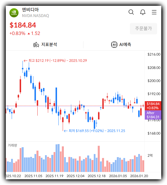 이때 가장 효과적인 도구가 바로 알파스퀘어 AI분석 서비스입니다. 방대한 데이터를 바탕으로 실시간 기술적 지표를 분석해 주기에, 변동성이 큰 시장에서 흔들리지 않는 기준을 잡을 수 있습니다. 엔비디아 전망 속에서 정확한 미래 주가 향방과 최적의 매매 타점을 알고 싶다면, 지금 바로 알파스퀘어 AI예측 서비스를 이용해 보시기 바랍니다. 성공 투자의 길은 데이터 기반의 객관적인 판단에서 시작됩니다.