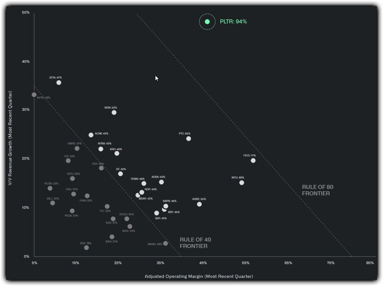 Rule of 40란? 소프트웨어 기업의 건강함을 측정하는 지표로, [매출 성장률 + 영업이익률]의 합이 40%를 넘으면 아주 우수한 기업으로 평가합니다. 팔란티어 테크놀로지스 는 무려 114%를 기록하며 '괴물 같은 효율'을 보여주고 있습니다.