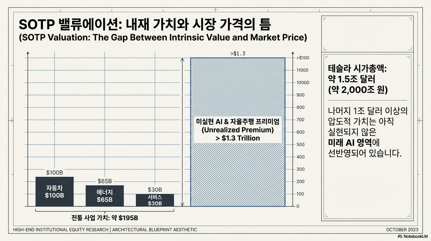 현재 테슬라의 시가총액은 약 1.5조 달러(약 2,000조 원)에 육박하지만, 이를 사업 부문별로 쪼개어 분석하는 SOTP(Sum Of The Parts) 방식으로 접근해 보면 상당한 프리미엄이 붙어 있음을 알 수 있습니다. 전통적인 자동차 제조 부문의 가치를 후하게 쳐서 약 1,000억 달러, 에너지 저장 사업을 650억 달러, 기타 서비스 부문을 300억 달러 수준으로 산정하더라도 나머지 1조 달러 이상의 가치는 아직 실현되지 않은 AI와 자율주행의 영역에 할당되어 있습니다.