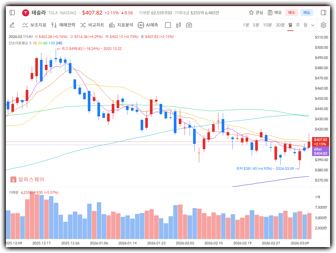 현재 테슬라의 주가는 심리적 저항선인 400달러 부근에서 힘겨루기를 이어가고 있습니다. 최근 거래량이 실린 상승세가 나타나며 강한 추세를 형성하고 있지만, 단기적으로는 이동평균선과의 이격도가 벌어져 있어 숨 고르기 장세가 나타날 가능성도 배제할 수 없습니다. 주요 지지선은 350달러 선에서 형성되어 있으며, 이 구간을 이탈하지 않는다면 자율주행 모멘텀을 바탕으로 한 추가 상승 시도가 이어질 것으로 보입니다.