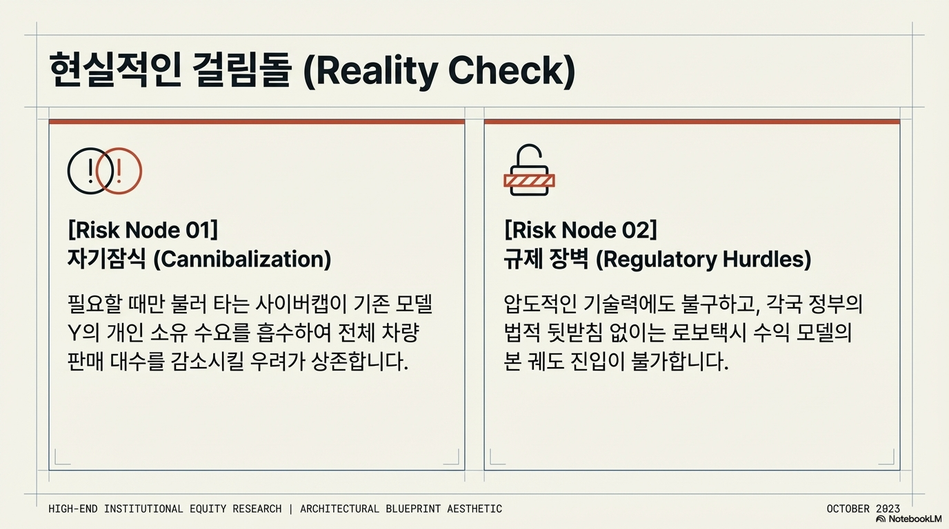 자율주행 중심의 사업 재편이 장밋빛 미래만을 약속하는 것은 아닙니다. 가장 큰 우려는 사이버캡이 기존의 모델 Y 수요를 흡수해버리는 '자기잠식(Cannibalization)' 현상입니다. 개인이 차량을 소유하는 시대에서 필요할 때만 불러 타는 로보택시 시대로 넘어가게 되면 전체 차량 판매 대수는 오히려 줄어들 수 있기 때문입니다.