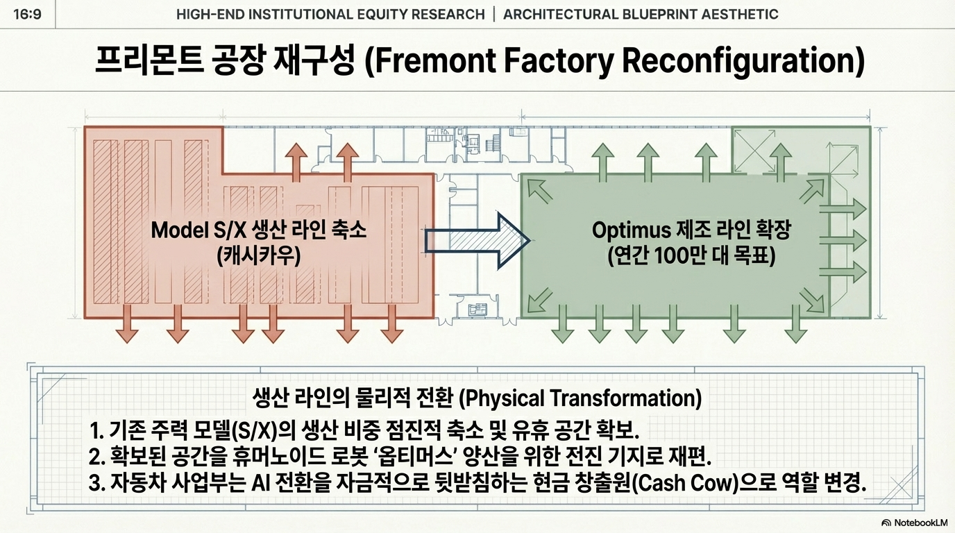 이 과정에서 기존 주력 모델인 모델 S와 모델 X의 생산 비중은 점진적으로 줄어들 것으로 보입니다. 실제로 프리몬트 공장의 유휴 공간은 향후 연간 100만 대 생산을 목표로 하는 휴머노이드 로봇 '옵티머스' 제조 라인으로 전환될 가능성이 큽니다. 결국 테슬라 의 자동차 사업은 인공지능 전환을 위한 현금 창출원(Cash Cow) 역할을 수행하게 되며, 진정한 성장은 소프트웨어 구독과 로보택시 운영 수익에서 발생할 것이라는 계산입니다. 따라서 향후 2~3년간의 테슬라 주가전망 역시 이러한 하드웨어 제조에서 소프트웨어 플랫폼으로의 전환 속도에 따라 크게 요동칠 가능성이 높습니다.