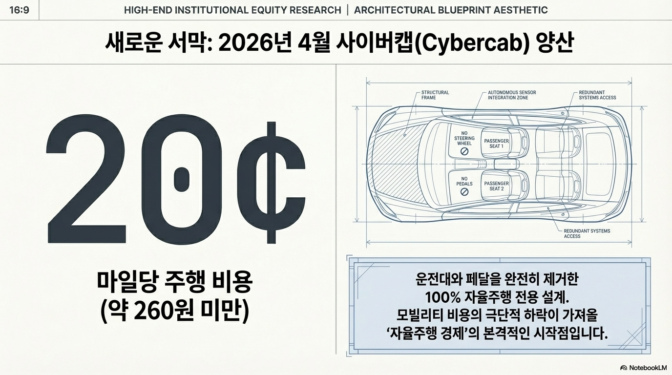 테슬라 의 미래를 결정지을 가장 핵심적인 변수는 2026년 4월로 예정된 '사이버캡(Cybercab)'의 양산 시작과 자율주행 로보택시 네트워크의 안착 여부입니다. 기존의 모델 3나 모델 Y가 인간 운전자를 전제로 설계된 차량이라면, 사이버캡은 운전대나 페달 같은 군더더기를 완전히 제거하고 오로지 자율주행만을 위해 설계된 모델입니다. 일론 머스크는 이 모델이 가동되기 시작하면 주행 비용을 마일당 20센트(약 260원) 미만으로 낮출 수 있다고 자신하고 있습니다.
