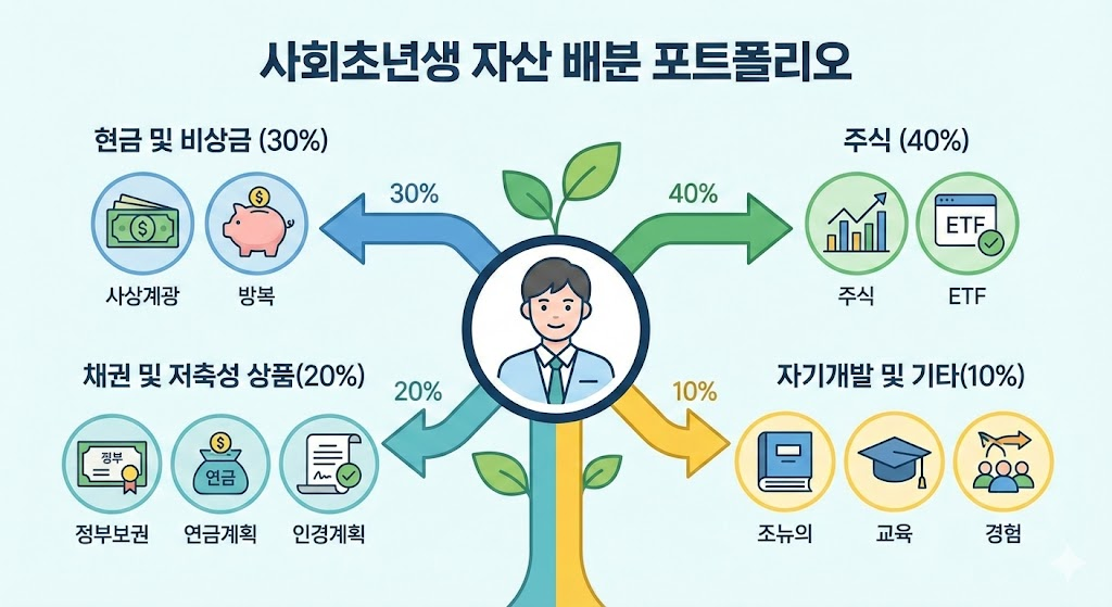A: 소득의 70~80%는 예적금이나 채권 같은 안전 자산에 넣어 시드머니를 모으는 데 집중하세요. 나머지 20~30%를 주식이나 펀드에 투자하며 시장 감각을 익히는 것이 정석입니다.