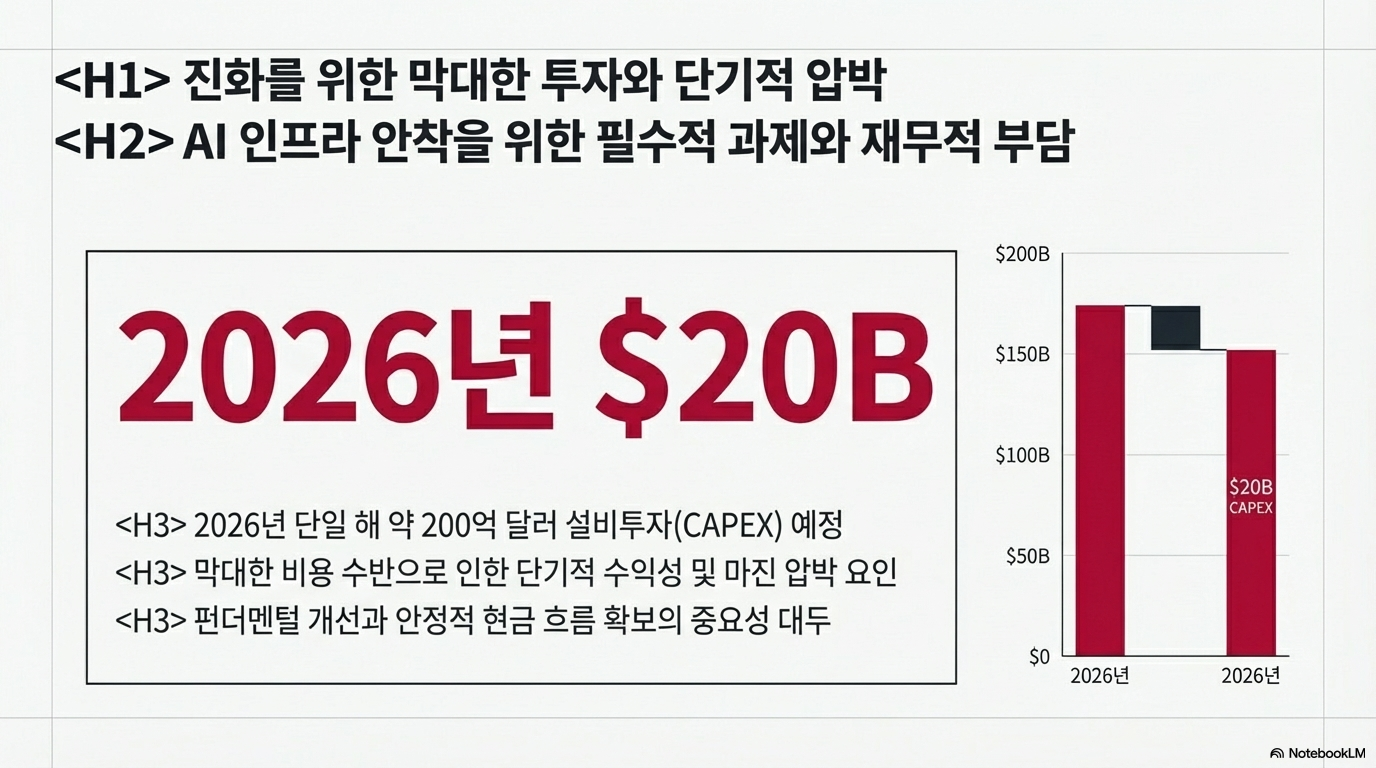 다만, 이러한 거대한 비전 뒤에는 막대한 비용 부담이라는 현실적인 문제가 존재합니다. 2026년 한 해에만 약 200억 달러에 달하는 설비투자(CAPEX)가 계획되어 있으며, 이는 대부분 AI 역량 강화와 자율주행 기술 고도화에 투입될 예정입니다. 공격적인 투자가 장기적으로는 해자가 되겠지만, 단기적으로는 재무적 부담과 수익성 저하를 불러올 수 있다는 점에서 투자자들의 고민이 깊어지는 지점입니다.
