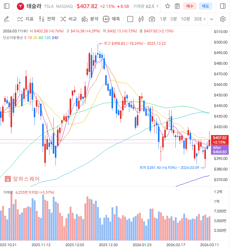 테슬라 의 현재 주가 흐름을 기술적으로 살펴보면, 380달러 부근의 주요 지지선에서 강한 하방 경직성을 확보하며 단기 반등을 모색하는 구간입니다. 최근 거래량이 실린 양봉이 출현하며 하락 추세를 멈추고 횡보 혹은 반등으로의 전환 신호를 보내고 있으나, 420달러 부근의 단기 저항선을 확실히 돌파하기 위해서는 앞서 언급한 AI 사업 부문의 구체적인 진척 상황이나 중국 시장에서의 판매 호조가 숫자로 증명되어야 할 것으로 보입니다.