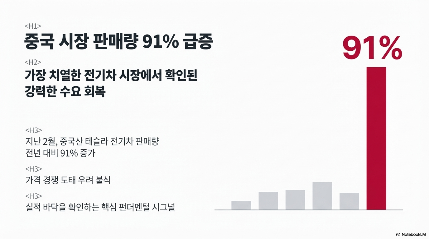 가장 경쟁이 치열한 중국 시장에서의 판매량 반등 또한 향후 테슬라 주가전망을 긍정적으로 검토하게 만드는 핵심 지표입니다. 지난 2월, 중국산 테슬라 전기차 판매량은 전년 대비 91% 급증하며 강력한 수요 회복세를 보였습니다. 이는 로컬 브랜드들의 파상공세와 가격 경쟁 심화로 인해 테슬라가 중국 시장에서 도태될 것이라는 시장의 공포를 어느 정도 잠재우는 결과입니다.