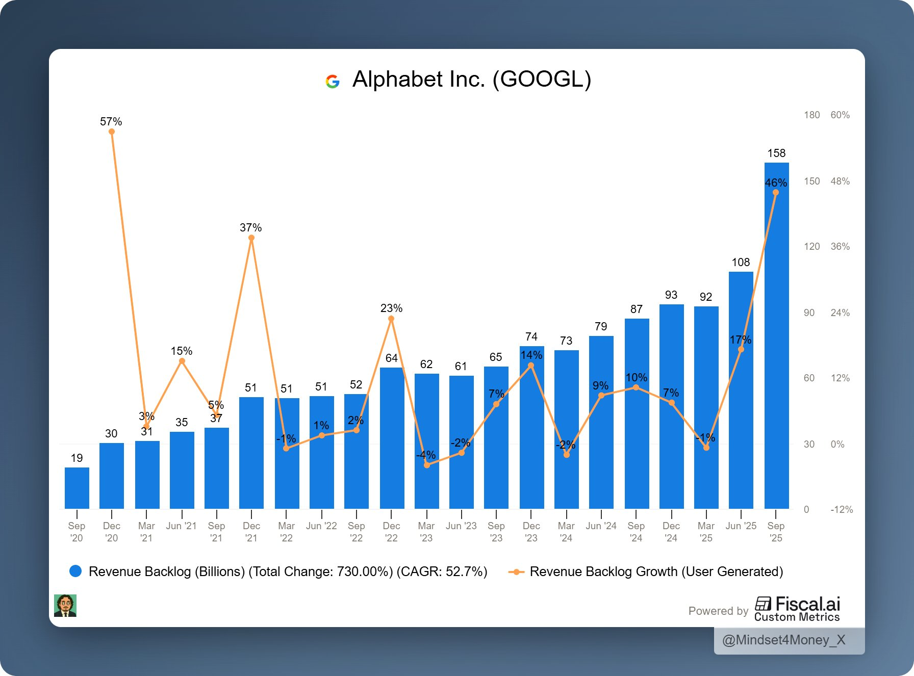 알파벳 Class C 의 미래 가치를 결정짓는 가장 강력한 지표는 바로 클라우드 부문의 ‘수주 잔고(Backlog)’입니다. 수주 잔고란 이미 계약은 체결했지만 아직 매출로 장부에 기록되지 않은 대기 물량을 말하는데요. 현재 알파벳의 클라우드 수주 잔고는 무려 1,550억 달러(한화 약 210조 원)에 달합니다.