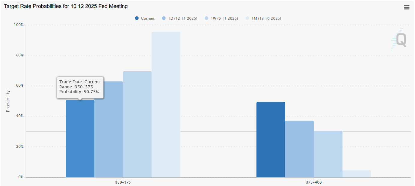 1개월전 95% 수준에 달했던 12월 금리인하 가능성이 현재 50%수준까지 떨어진 상황