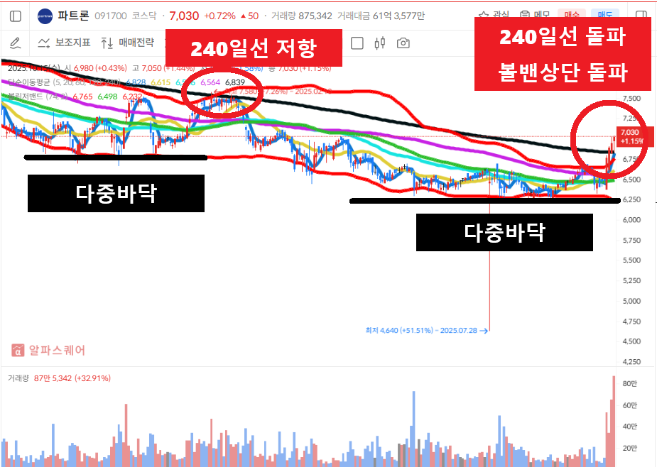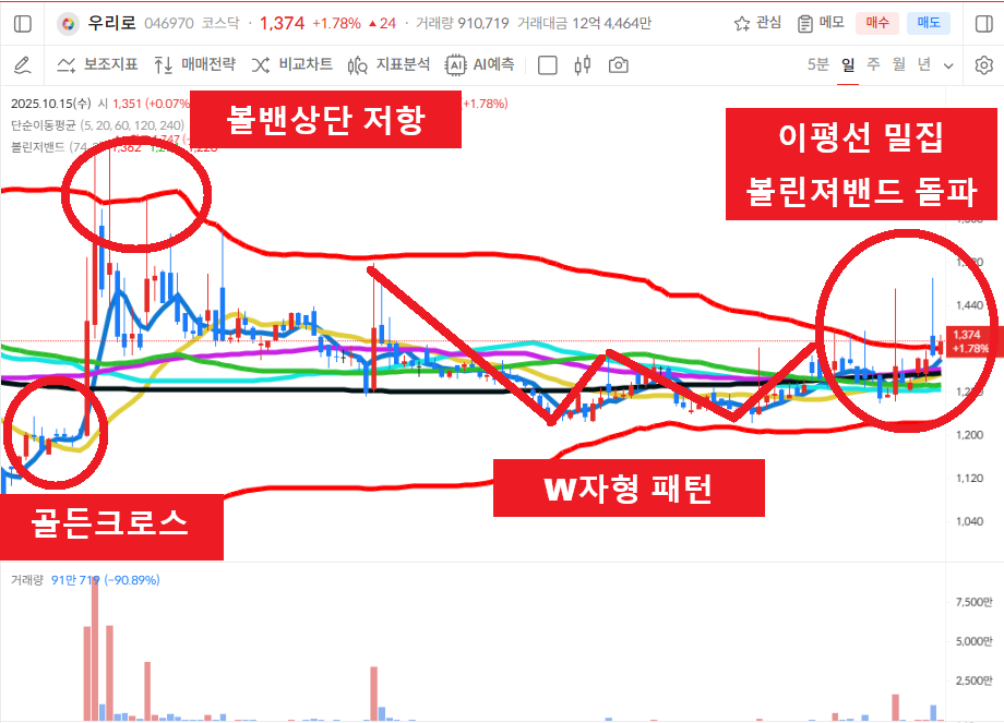■ 에셋마스터의 [1] 돌고래차트는 매매기준. - 60일선을 이탈하고 급격하게 하락하던 주가가(가격조정,기간조정) 하락을 멈추고 캔들이 5일선을 돌파 후 안착하고, 5일선은 20일선을 골든크로스 해주어야 합니다. 다음날 혹은 그다음 날 5일선 지지선에서 매수 걸고 기다리는데, 이때 60일선 이탈 이후 급격한 하락은 신뢰도가 높습니다. - 참고, 20일선 이탈 시 손절잡고 진행하는 기준입니다. #돌고래차트 #주식투자 #주식공부 #주식공부방 ■ 에셋마스터의 [2] 볼린져밴드 돌고래차트 매매기준. 볼린져밴드 기간을 69로 설정하고, 캔들이 설정한 볼린져밴드 상단선을 돌파해 주어야 합니다. 이때 5일선이 볼린져밴드 상단선을 골든크로스 해주어야 신뢰도가 높습니다. 5일선이 볼밴상단선을 돌파하고 5일선 지지선에서 매수 기준을 잡습니다. -참고. 수익 중이면 5일선이탈시 비중축소 볼밴이탈시 올매도 기준입니다. 손실 중이면 볼밴상단선 이탈 시 손절선을 잡습니다. #볼밴돌고래차트 #주식공부방 #주린이공부 ■ 돌고래차트 매매는 항상 분할매수(2회~3회)를 원칙으로 합니다. 주식공부방 기준은 1차매수 2차매수로 나눠서하는 투자를 원칙으로 하며, 1차 돌고래차트 만들고, 이탈하면 2차매수도 돌고래차트를 재차 만들때 재투입합니다. #주식투자시 분할매수를 못하면 주식에서 실패할 수 밖에 없습니다. ■ 수익금은 꼭 인출해서 별도의 CMA계좌로 옮겨두세요.. 이후 폭락장(개인들의 반대매매가 나오는시점)이 오면 그때 재투자를 원칙으로 합니다. ■ 본 내용은 에셋마스터가 직접 #주식공부하는 내용을 공유하여 올려드리는 것입니다. ["일정한 대가를 받고 주식에 대한 종목 추천이나 1:1 리딩은 절대 하지 않습니다".] 주식투자에 대한 교육 차원이며 종목 추천을 드리는 것이 아님을 꼭 밝혀드리고, 주식투자에 대한 수익이나 손실은 본인의 몫임을 말씀드립니다. ■ #주식투자에 앞서 #주식공부는 증권사의 모의투자로 본인의 실력을 향상시키는 것을 먼저 권유 드립니다. #우리로 #차트분석 #기술적분석 광분배기의 제작 및 판매사업과 보안솔루션 사업을 영위하고 있으며, 주요매출은 HDD, SSD등 SI 사업 부문에서 발생하고 있는 시가총액 602억원의 코스닥 상장기업입니다. 가격조정을 받으면서 하락하던 주가는 하락을 멈추고 5일선이 20일선을 골든크로스하고 단기 급등시세를 보여주면서 볼린져밴드 상단선까지 상승하고 눌림목 자리에서 눌림이후 재차 볼린져밴드 상단선까지 반등이후 5일선을 이탈하면서 조정을 받고 있습니다. 상승이후 가격조정과 기간조정을 받으면서 하락하던 주가는 쌍바닥 W자형 패턴을 만들고 이평선을 밀집시켜주고 거래량을 동반해 주면서 5일선이 우상향으로 확장국면에 있습니다. 매수밴드 5일선과 120일선의 지지선에서 흐름지켜보고 60일선 이탈시 손절선 잡아보겠습니다. #우리로 #재무분석 #기본적분석 우리로의 매출액은 2022년 990억원에서 2024년 474억원으로 감소하고있으며, 당기순이익은 2022년 -35억원에서 2024년 -51억원으로 적자폭 확대중에 있습니다. 부채비율은 2022년 61%에서 2024년 50%로 감소하고 있으며, 유보율은 2022년 146%에서 2024년 90%로 감소하고 있습니다. 당기순이익 적자진행중이고, 유보율이 낮은 수준으로 단기로 접근이 좋아 보입니다. #우리로 #시장이슈및테마 #양자암호관련주 #양자컴퓨터관련주 #보안관련주로 엮여 있는 상황에서 이슈받는지 흐름지켜보겠습니다. #파트론 #차트분석 #기술적분석 RF, 반도체패키징 등의 부품사업과 웨어러블기기, 의료기기, 전자담배 등의 제품판매, 진동모터, LED 등의 사업을 영위하고 있는 시가총액 4007억원의 코스닥 상장기업입니다. 가격조정을 받으면서 역배열 차트에서 추세 하락하는 모습을 보여주고 있는 상황에서 다중바닥을 형성하고 단기 반등하면서 볼린져밴드 상단선과 240일선의 강한 저항선까지 반드이후 재차 조정을 받고 있습니다. 조정을 받고 하락하는 상황에서 전저점을 이탈하면서 추세적인 하락세를 멈추지 못하고 있는 상황에서 재차 다중저점을 형성하고 반등하는 상황에서 장기이평선 240일선을 돌파하고 볼린져밴드 상단선까지 돌파하는 강한 모습을 보여주고 있습니다. 매수밴드 5일선과 240일선의 지지선에서 흐름지켜보고 볼린져밴드 상단선 이탈시 손절선 잡아보겠습니다. #파트론 #재무분석 #기본적분석 파트론의 매출액은 2022년 1조 2219억원에서 2024년 1조 4864억원으로 증가하고 있으며, 당기순이익은 2022년 429억원에서 2024년 559억원으로 증가하고 있습니다. 부채비율은 2022년 36%에서 2024년 33%로 감소하고 있으며, 유보율은 2022년 1632%에서 2024년 1764%로 증가하고 있습니다. #파트론 #시장이슈및테마 #웨어러블관련주 #생체인식관련주 #스마트폰관련주 #카메라관련주로 엮여 있는 상황에서 이슈받는지 흐름지켜보겠습니다. #네이버에셋마스터 #돌고래차트 #야구공주식이론 #주식공부방 #볼린져밴드설정 #5일선매매기법