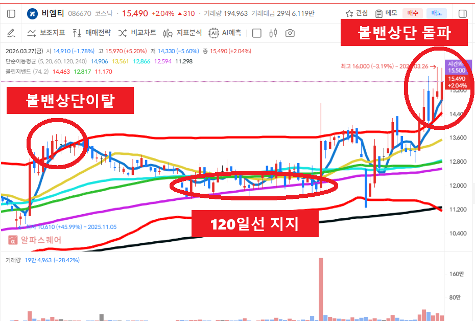 ■ 에셋마스터의 [1] 돌고래차트는 매매기준. - 60일선을 이탈하고 급격하게 하락하던 주가가(가격조정,기간조정) 하락을 멈추고 캔들이 5일선을 돌파 후 안착하고, 5일선은 20일선을 골든크로스 해주어야 합니다. 다음날 혹은 그다음 날 5일선 지지선에서 매수 걸고 기다리는데, 이때 60일선 이탈 이후 급격한 하락은 신뢰도가 높습니다. - 참고, 20일선 이탈 시 손절잡고 진행하는 기준입니다. #돌고래차트 #주식투자 #주식공부 #주식공부방 ■ 에셋마스터의 [2] 볼린져밴드 돌고래차트 매매기준. 볼린져밴드 기간을 74로 설정하고, 캔들이 설정한 볼린져밴드 상단선을 돌파해 주어야 합니다. 이때 5일선이 볼린져밴드 상단선을 골든크로스 해주어야 신뢰도가 높습니다. 5일선이 볼밴상단선을 돌파하고 5일선 지지선에서 매수 기준을 잡습니다. -참고. 수익 중이면 5일선이탈시 비중축소 볼밴이탈시 올매도 기준입니다. 손실 중이면 볼밴상단선 이탈 시 손절선을 잡습니다. #볼밴돌고래차트 #주식공부방 #주린이공부 ■ 돌고래차트 매매는 항상 분할매수(2회~3회)를 원칙으로 합니다. 주식공부방 기준은 1차매수 2차매수로 나눠서하는 투자를 원칙으로 하며, 1차 돌고래차트 만들고, 이탈하면 2차매수도 돌고래차트를 재차 만들때 재투입합니다. #주식투자시 분할매수를 못하면 주식에서 실패할 수 밖에 없습니다. ■ 수익금은 꼭 인출해서 별도의 CMA계좌로 옮겨두세요.. 이후 폭락장(개인들의 반대매매가 나오는시점)이 오면 그때 재투자를 원칙으로 합니다. ■ 본 내용은 에셋마스터가 직접 #주식공부하는 내용을 공유하여 올려드리는 것입니다. ["일정한 대가를 받고 주식에 대한 종목 추천이나 1:1 리딩은 절대 하지 않습니다".] 주식투자에 대한 교육 차원이며 종목 추천을 드리는 것이 아님을 꼭 밝혀드리고, 주식투자에 대한 수익이나 손실은 본인의 몫임을 말씀드립니다. ■ #주식투자에 앞서 #주식공부는 증권사의 모의투자로 본인의 실력을 향상시키는 것을 먼저 권유 드립니다. #비엠티 #차트분석 #기술적분석 산업용 정밀 피팅, 및 밸브와 전기분전반 생산업을 영위하고 있는 시가총액 1506억원의 코스닥 상장기업입니다. 역배열로 가격조정을 받으면서 하락하던 주가는 240일선을 돌파하면서 정배열차트를 만들고 추세 우상향하는 패턴을 만들고 상승흐름중에 있습니다. 추세 우상향 하면서 단기 반등을 주고 상승하던 주가는 조정시 120일선의 지지선에서 재차 반등을 주고 현재 볼린져밴드 상단선을 돌파하는 위치에 있습니다. 매수밴드 5일선과 볼린져밴드 상단선의 지지선에서 흐름지켜보고 볼린져밴드 상단선 이탈시 손절선 잡아보겠습니다. #비엠티 #재무분석 #기본적분석 비엠티의 매출액은 2022년 1421억원에서 2024년 1328억원으로 감소하고 있으며, 당기순이익은 2022년 149억원에서 2024년 40억원으로 감소하고 있습니다. 부채비율은 2022년 123%에서 2024년 102%로 감소하고 있으며, 유보율은 2022년 2254%에서 2024년 2623%로 증가하고 있습니다. #비엠티 #시장이슈및테마 #피팅밸브관련주 #조선기자재관련주 #원전관련주로 엮여 있는 상황에서 이슈받는지 흐름지켜보겠습니다. #무림SP #차트분석 #기술적분석 아트지, 백상지, 기타 특수지를 생산 및 판매사업을 영위하고 있는 시가총액 357억원의 코스닥 상장기업입니다. 240일선을 돌파하면서 단기 상승흐름이후 20일선의 지지선에서 지지하는 모습을 보여주는 것 처럼 보였으나 이탈하면서 조정을 받고 있으며, 240일선의 장기 이평선까지 이탈하면서 조정을 받고 있습니다. 240일선을 이탈하면서 조정을 받는 상황에서 윗꼬리를 보여주고 있는 상황에서 최근에는 240일선과 볼린져밴드 상단선을 돌파하고 윗꼬리를 작게 만들면서 돌파후 안착하는 모습을 보여주고 있습니다. 매수밴드 5일선과 볼린져밴드 그리고 240일선의 지지선에서 흐름지켜보고 5일선 이탈시 손절선 잡아보겠습니다. #무림SP #재무분석 #기본적분석 무림SP의 매출액은 2023년 1621억원에서 2025년 2057억원으로 증가하고 있으며, 당기순이익은 2023년 -57억원에서 2025년 -17억원으로 적자폭이 줄어들고 있습니다. 부채비율은 2023년 57%에서 2025년 71%로 증가하고 있으며, 유보율은 2023년 1539%에서 2025년 1537%로 횡보하고 있습니다. #무림SP #시장이슈및테마 #제지관련주 #일회용품관련주 #포장재관련주로 엮여 있는 상황에서 이슈받는지 흐름지켜보겠습니다. #네이버에서 에셋마스터 #돌고래차트 #야구공주식이론 #주식공부방 #볼린져밴드설정 #5일선매매기법