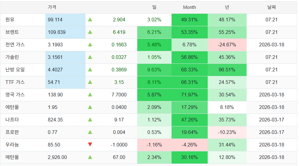 이란과 이스라엘의 에너지시설 타격으로 공급차질 우려에 에너지 가격 상승흐름