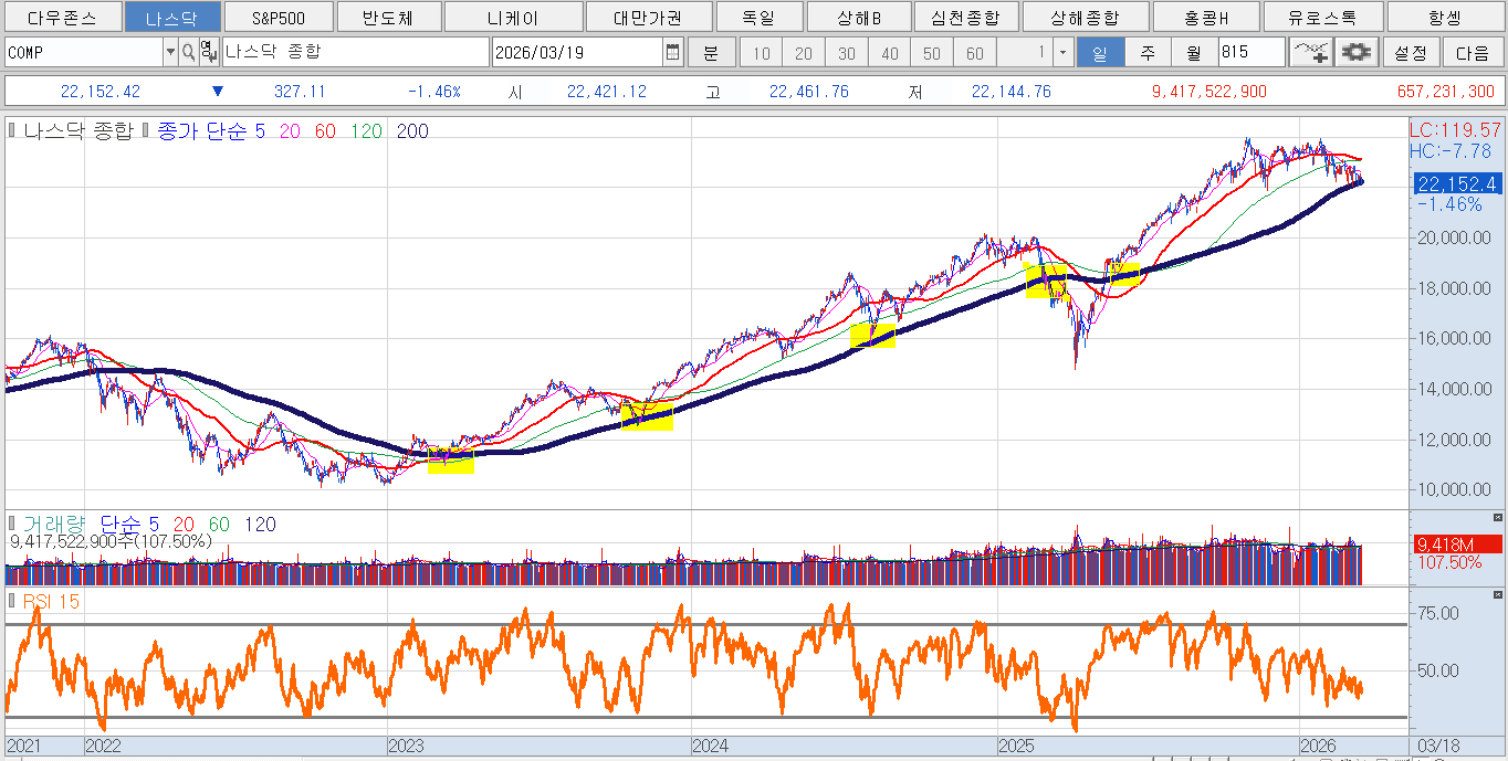 나스닥은 200일 선 부근까지 내려온 모습
