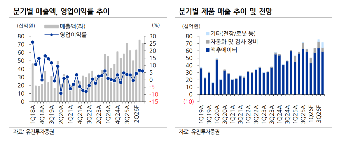 1Q26F 실적은 매출 500억원, 영업손실 2억원으로 예상됐다. 전형적인 비수기라 숫자만 보면 아쉬운 구간이다. 액추에이터 매출은 432억원, 자동화·검사장비는 68억원, 전장·로봇은 아직 0에 가깝다. 이 때문에 단기 실적만 보면 “아직 아무것도 시작되지 않았다”고 느낄 수 있다.