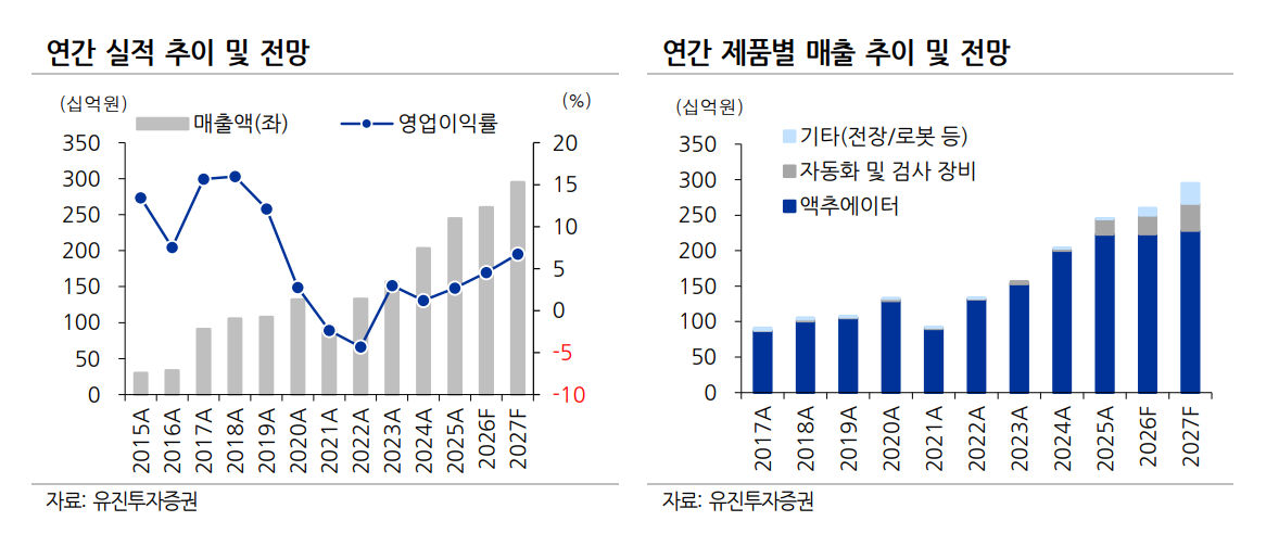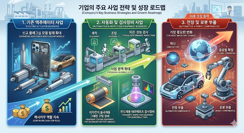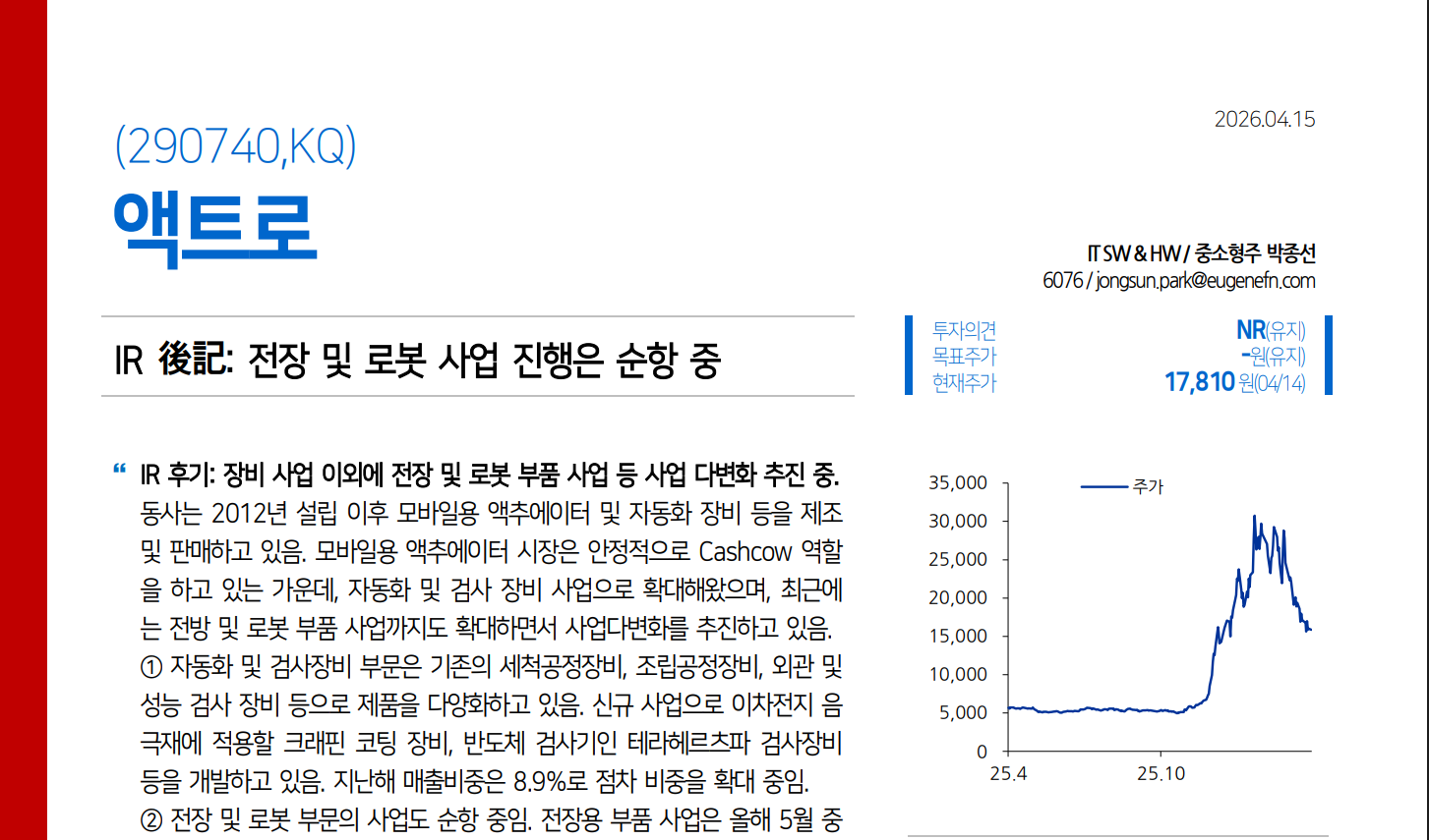 액트로 리포트는 목표주가 제시가 없는 NR 보고서지만, 투자자 입장에서는 오히려 읽을 포인트가 분명하다. 기존 모바일 액추에이터 사업이 안정적인 캐시카우 역할을 하는 가운데, 자동화·검사장비 그리고 전장·로봇 부품이 새 성장축으로 올라오는 초기 국면이라는 점이다. 아직은 신규 사업 매출이 숫자로 크지 않지만, 올해와 내년이 “가능성”에서 “실적 반영”으로 넘어가는 분기점이라는 메시지가 강하다.