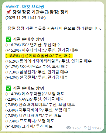 그리고 오늘도 오전 11시 기준으로 삼성에피스홀딩스가 기관 순매수 상위에 등장했네요.