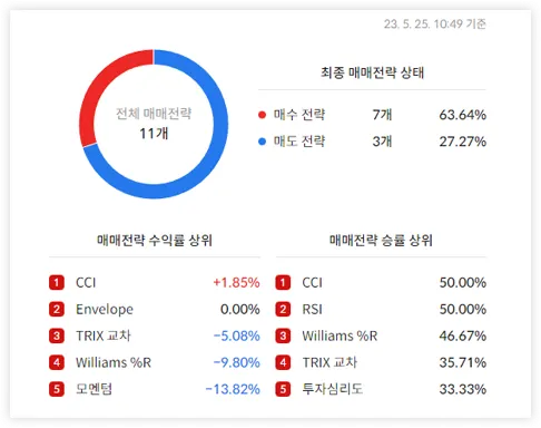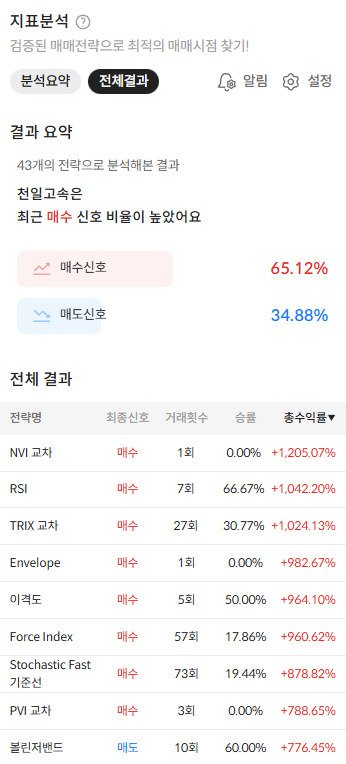 - 수익률BEST 전략 추천: 관심종목에 일일이 대입해 볼 필요 없습니다. 종목별로 43가지 보조지표를 적용해서 시뮬레이션 돌린 후, 가장 높은 수익률을 기록한 'BEST 전략'을 즉시 뽑아줍니다.