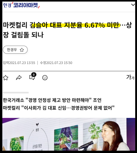 21년 마켓컬리 김슬아 대표가 6.67% 지분으로 상장에 제동이 걸렸던 사례도 있죠.