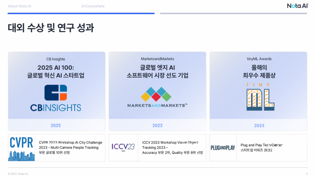 IR자료 9P를 보면, ‘CBINSIGHTS 2025 AI100: 글로벌 혁신 AI 스타트업’에 선정된 점이 눈에 띕니다.