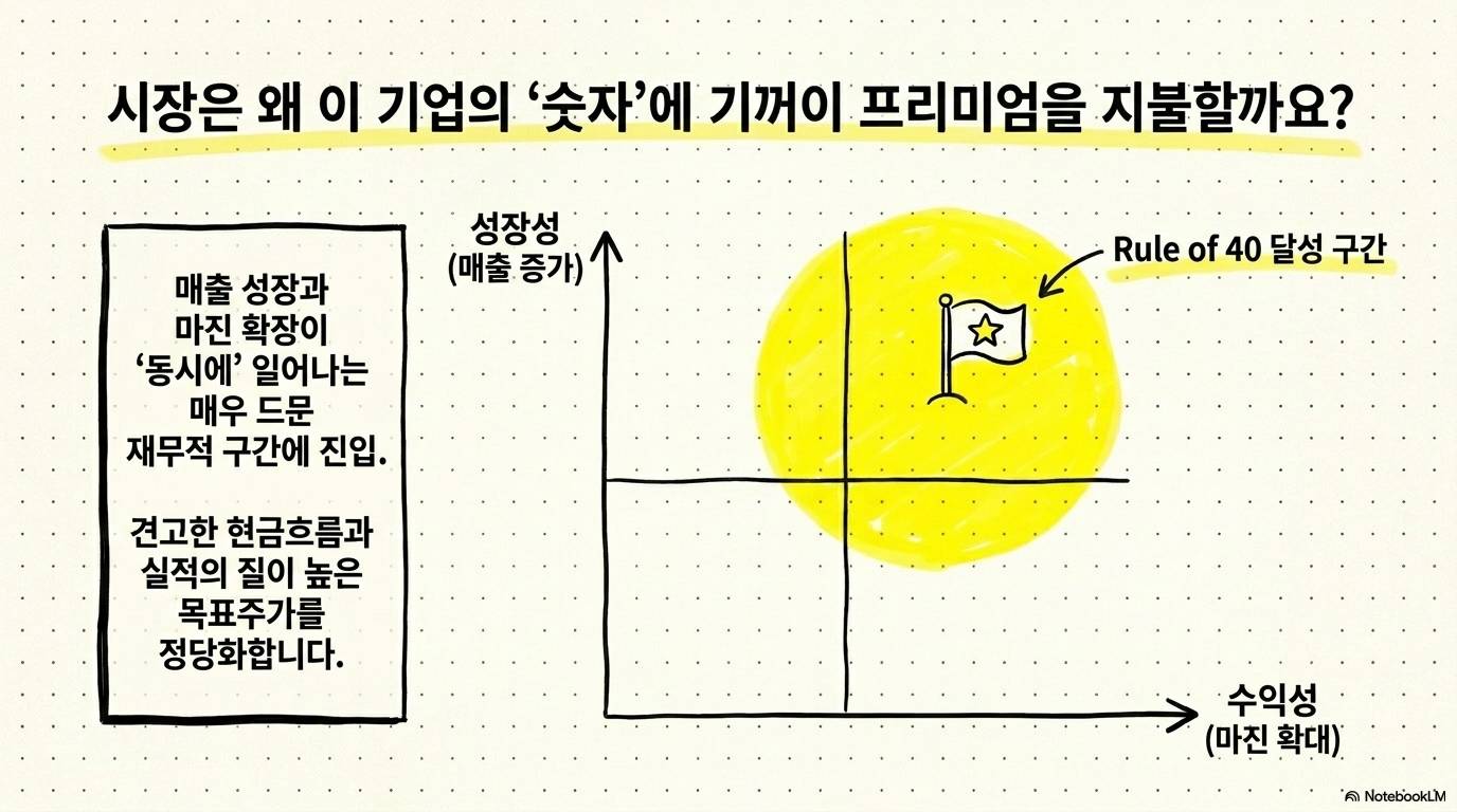 Rule of 40 같은 지표가 높게 나오는 기업은 시장이 쉽게 포기하지 않는다. 다만 그 기대가 이미 가격에 반영된 상태라면, 좋은 실적이 나와도 주가가 덜 오르고 작은 실망에는 크게 흔들릴 수 있다. 이 비대칭성을 이해해야 실제 투자 판단이 더 차분해진다.