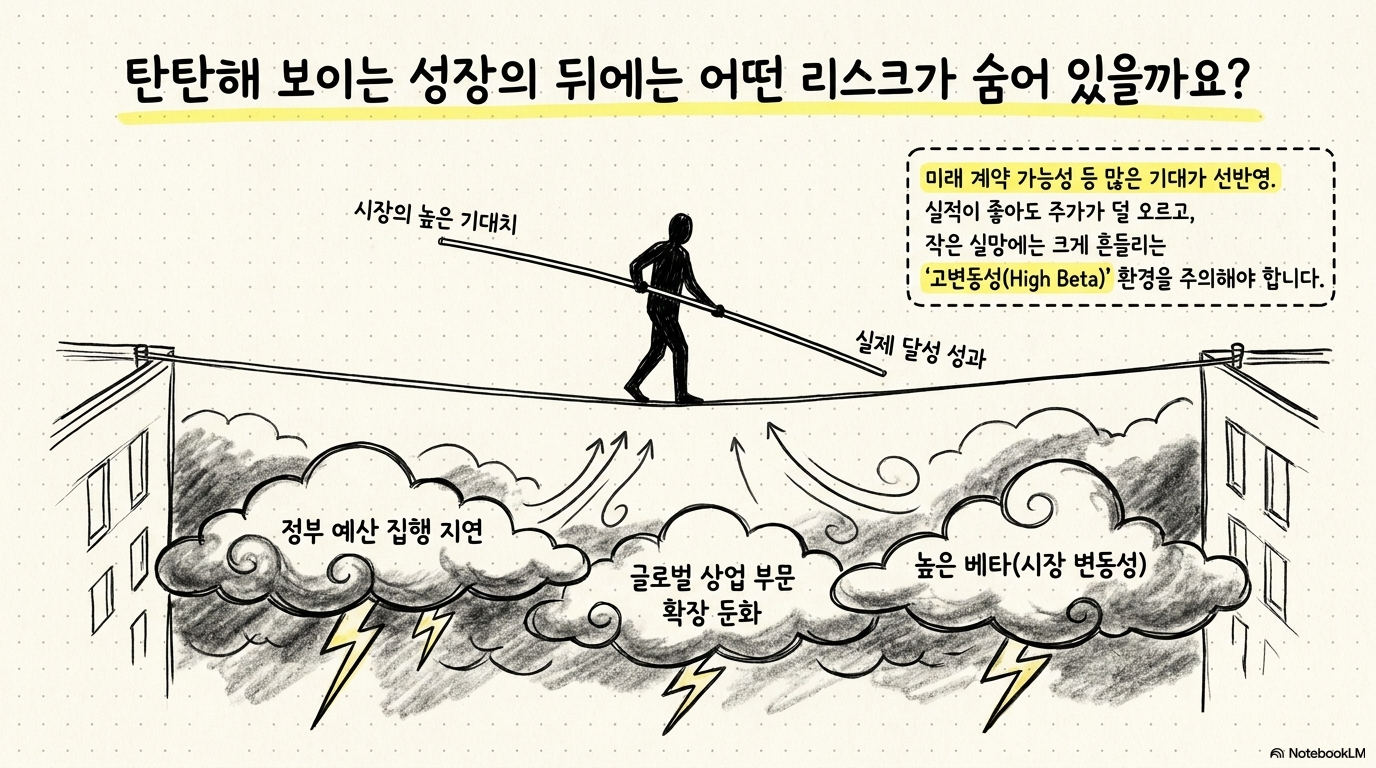 주가가 급등했던 구간에는 미래 계약 가능성까지 선반영된 측면이 있다. 따라서 실제 수주와 매출 인식 속도가 기대에 못 미치면 본업이 나쁘지 않아도 주가가 조정받을 수 있다. 결국 투자자는 숫자의 절대 수준보다 기대치와 실제 성과 사이의 간격을 더 민감하게 봐야 한다.