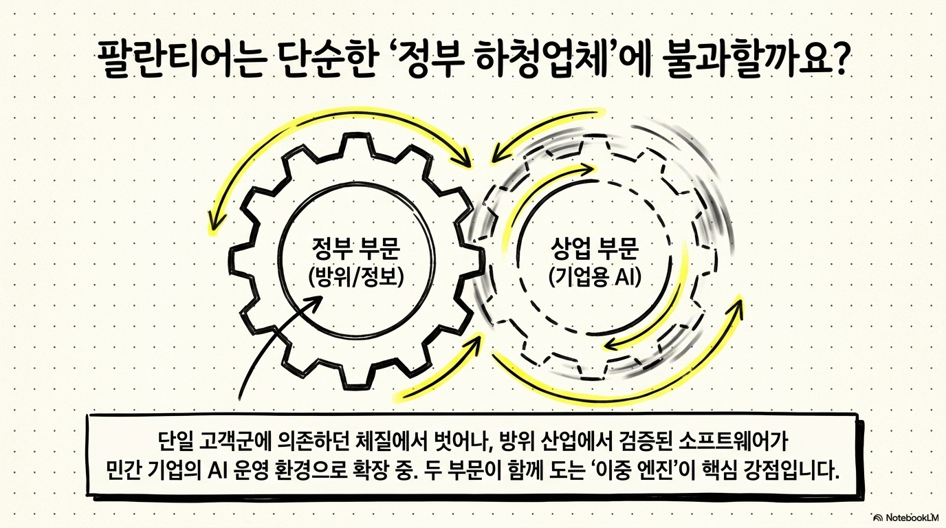 지금 팔란티어 테크놀로지스 주가 전망을 지지하는 가장 큰 근거는 정부와 민간 두 축이 동시에 성장하고 있다는 점이다. 방위와 정보 분야에서 검증된 소프트웨어 스택이 민간 기업의 데이터 통합과 AI 운영 환경으로 확장되면서, 단일 고객군에 기대던 회사에서 범용 플랫폼 기업으로 인식이 바뀌고 있다. 이런 전환은 단순 매출 증가보다 더 큰 의미를 갖는다.