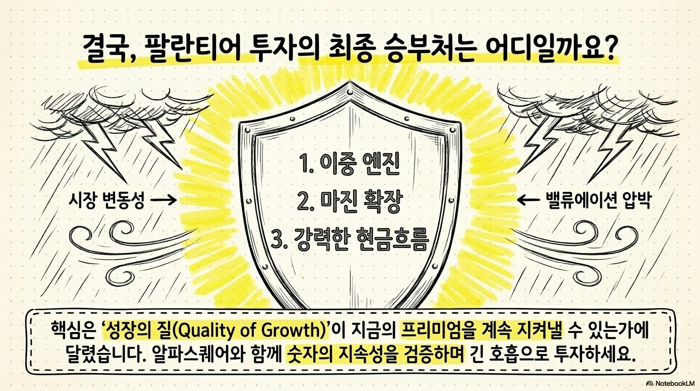또 하나의 변수는 시장 전체의 스타일 변화다. 금리가 높고 변동성이 커지는 환경에서는 성장률보다 가시성이 더 중요하게 평가된다. 팔란티어 테크놀로지스 가 높은 가시성을 계속 보여준다면 프리미엄 방어가 가능하지만, 그렇지 않다면 같은 숫자에도 시장 반응은 달라질 수 있다.