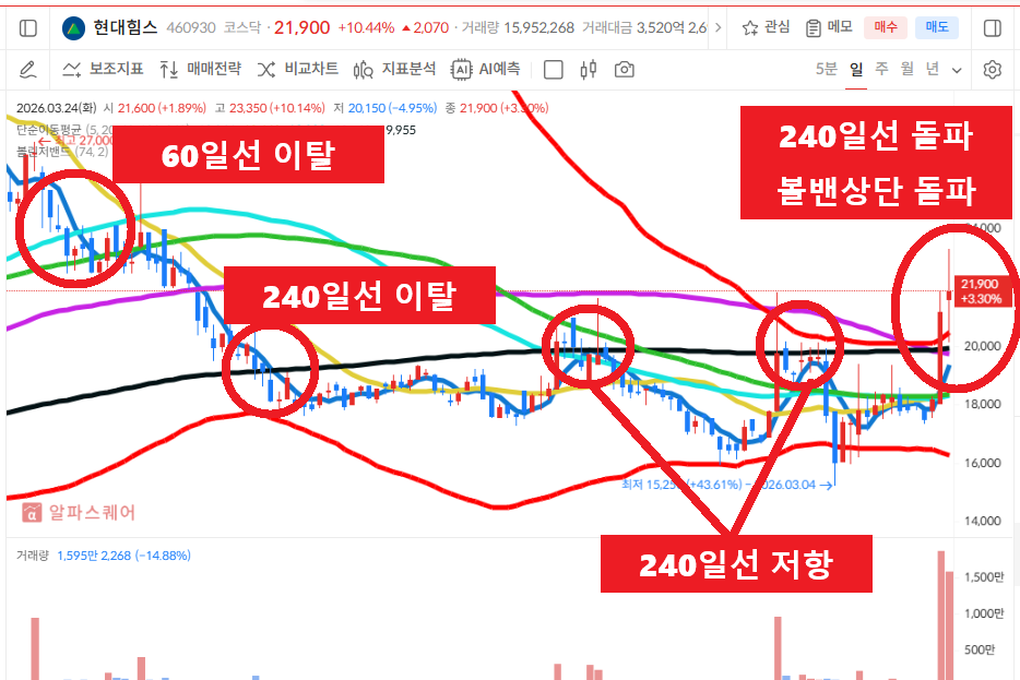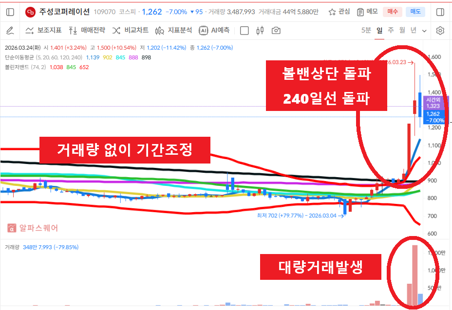 ■ 에셋마스터의 [1] 돌고래차트는 매매기준. - 60일선을 이탈하고 급격하게 하락하던 주가가(가격조정,기간조정) 하락을 멈추고 캔들이 5일선을 돌파 후 안착하고, 5일선은 20일선을 골든크로스 해주어야 합니다. 다음날 혹은 그다음 날 5일선 지지선에서 매수 걸고 기다리는데, 이때 60일선 이탈 이후 급격한 하락은 신뢰도가 높습니다. - 참고, 20일선 이탈 시 손절잡고 진행하는 기준입니다. #돌고래차트 #주식투자 #주식공부 #주식공부방 ■ 에셋마스터의 [2] 볼린져밴드 돌고래차트 매매기준. 볼린져밴드 기간을 74로 설정하고, 캔들이 설정한 볼린져밴드 상단선을 돌파해 주어야 합니다. 이때 5일선이 볼린져밴드 상단선을 골든크로스 해주어야 신뢰도가 높습니다. 5일선이 볼밴상단선을 돌파하고 5일선 지지선에서 매수 기준을 잡습니다. -참고. 수익 중이면 5일선이탈시 비중축소 볼밴이탈시 올매도 기준입니다. 손실 중이면 볼밴상단선 이탈 시 손절선을 잡습니다. #볼밴돌고래차트 #주식공부방 #주린이공부 ■ 돌고래차트 매매는 항상 분할매수(2회~3회)를 원칙으로 합니다. 주식공부방 기준은 1차매수 2차매수로 나눠서하는 투자를 원칙으로 하며, 1차 돌고래차트 만들고, 이탈하면 2차매수도 돌고래차트를 재차 만들때 재투입합니다. #주식투자시 분할매수를 못하면 주식에서 실패할 수 밖에 없습니다. ■ 수익금은 꼭 인출해서 별도의 CMA계좌로 옮겨두세요.. 이후 폭락장(개인들의 반대매매가 나오는시점)이 오면 그때 재투자를 원칙으로 합니다. ■ 본 내용은 에셋마스터가 직접 #주식공부하는 내용을 공유하여 올려드리는 것입니다. ["일정한 대가를 받고 주식에 대한 종목 추천이나 1:1 리딩은 절대 하지 않습니다".] 주식투자에 대한 교육 차원이며 종목 추천을 드리는 것이 아님을 꼭 밝혀드리고, 주식투자에 대한 수익이나 손실은 본인의 몫임을 말씀드립니다. ■ #주식투자에 앞서 #주식공부는 증권사의 모의투자로 본인의 실력을 향상시키는 것을 먼저 권유 드립니다. #현대힘스 #차트분석 #기술적분석 HD한국조선해양 주식회사의 선박블럭 및 배관 제조부문의 자산을 일부 양수하는 현물출자에 의하여 설립된 시가총액 7954억원의 코스닥 상장기업입니다. 볼린져밴드 상단선을 돌파하고 단기 상승하던 주가는 볼리져밴드 상단선을 이탈하면서 조정을 받고 하락하는 상황에서 60일선을 이탈하면서 조정을 박고 240일선의 장기 이평선까지 이탈하는 모습을 보여주고 있습니다. 240일선의 장기이평선을 이탈하고 조정을 받던 주가는 240일선의 저항선을 돌파시도 하는 상황에서 돌파하지 못하고 재차 조정중에서 최근 240일선과 볼린져밴드 상단선을 돌파하는 강한 매수세를 보여주고 있습니다. 매수밴드 240일선과 볼린져밴드 상단선의 지지선에서 흐름지켜보고 240일선 이탈시 손절선 잡아보겠습니다. #현대힘스 #재무분석 #기본적분석 현대힘스의 매출액은 2023년 1892억원에서 2025년 2482억원으로 증가하고 있으며, 당기순이익은 2023년 101억원에서 2025년 214억원으로 증가하고 있습니다. 부채비율은 2023년 41%에서 2025년 31%로 감소하고 있으며, 유보율은 2023년 1094%에서 2025년 1324%로 증가하고 있습니다. #현대힘스 #시장이슈및테마 #마스가관련주 #조선관련주 #조선기자재관련주로 엮여 있는 상황에서 이슈받는지 흐름지켜보겠습니다. #주성코퍼레이션 #차트분석 #기술적분석 통신네트워크사업, 커스터머사업, 제지사업, 유통사업을 영위하고 있는 시가총액 666억원의 코스피 상장기업입니다. 거래정지 이후 급등락을 보여주던 주가는 거래량이 실종되면서 기간조정을 받으면서 횡보하고 있습니다. 기간조정을 받으면서 횡보하던 주가는 대량거래량을 동반하면서 240일선과 볼린져밴드 상단선을 돌파하는 급등시세를 보여주고 있습니다. 매수밴드 5일선과 볼린져밴드 상단선의 지지지선에서 흐름지켜보고 볼린져밴드 상단선 이탈시 손절선 잡아보겠습니다. #주성코퍼레이션 #재무분석 #기본적분석 주성코퍼레이션의 매출액은 2023년 239억원에서 2025년 854억원으로 증가하고 있으며, 당기순이익은 2022년 -14억원에서 2024년 20억원으로 흑자전환해 주고 있습니다. 부채비율은 2023년 53%에서 2025년 45%로 감소하고 있으며, 유보율은 2023년 -19%에서 2025년 6%로 양전환 해주고 있습니다. #주성코퍼레이션 #시장이슈및테마 #통신장비관련주 #네크워크관련주 #중계기관련주로 엮여 있는 상황에서 이슈받는지 흐름지켜보겠습니다. #네이버에서 에셋마스터 #돌고래차트 #야구공주식이론 #주식공부방 #볼린져밴드설정 #5일선매매기법