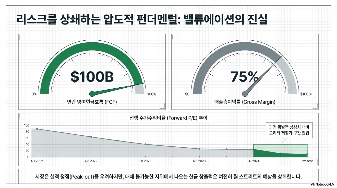 현재 엔비디아의 주가수익비율(P/E)은 과거 성장치 대비 낮은 수준에서 거래되고 있어 밸류에이션 측면에서는 오히려 저평가 구간이라는 해석도 존재함. 시장은 향후 몇 년 뒤의 실적 정점을 미리 우려하고 있지만, 엔비디아가 보여주는 이익 창출 능력은 여전히 압도적임. 연간 약 1,000억 달러에 달하는 잉여현금흐름을 바탕으로 경쟁사를 인수하거나 자사주를 매입하며 주주 가치를 높일 여력도 충분함.