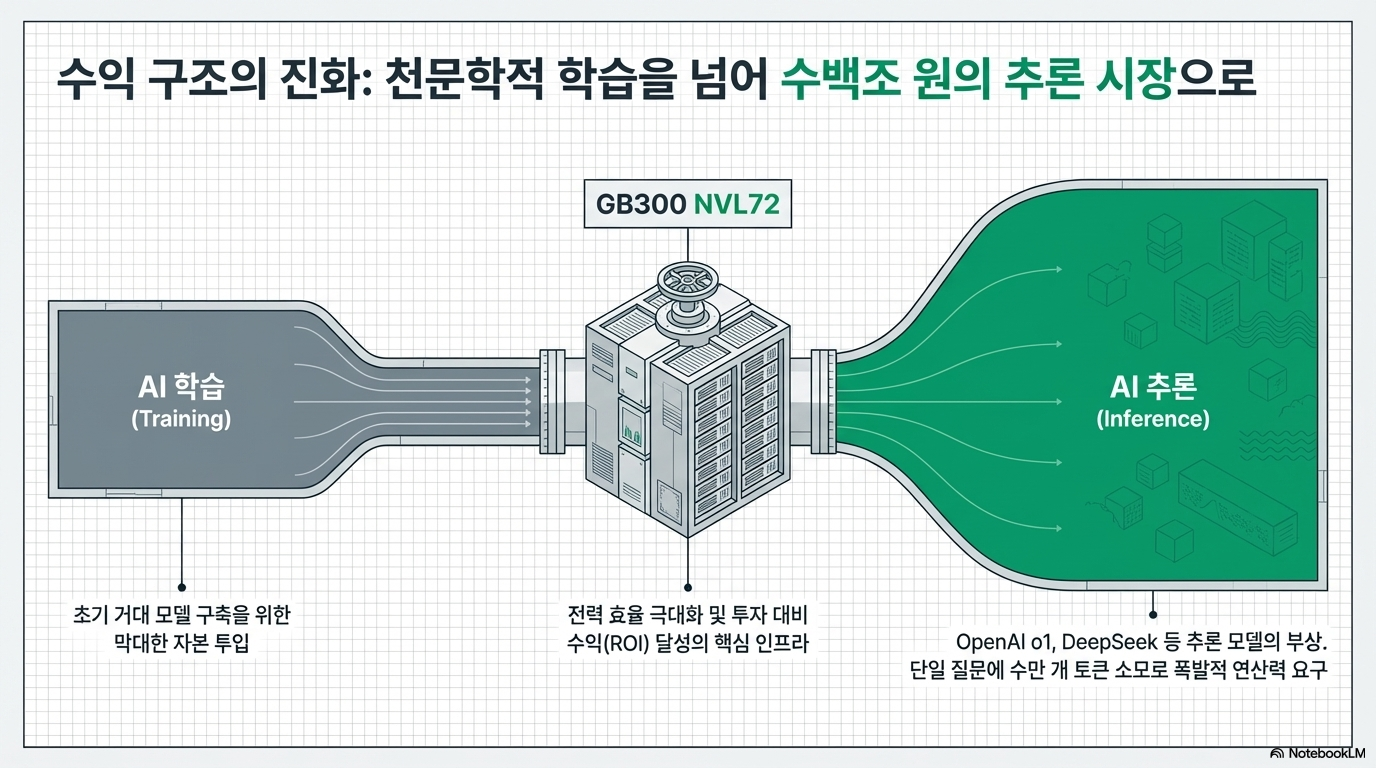 엔비디아의 매출 구조는 이제 모델 학습(Training)을 넘어 추론(Inference) 시장으로 빠르게 확장되는 추세임. 과거에는 AI 모델을 만드는 데 돈이 많이 들었다면, 이제는 만들어진 AI를 실제로 사용하는 과정에서 발생하는 매출이 급증하고 있음. 오픈AI의 o1이나 딥시크(DeepSeek) 같은 추론 기반 모델들은 복잡한 질문 하나에 수만 개의 토큰을 소모하며 엄청난 연산력을 요구함. 엔비디아의 새로운 랙 시스템인 GB300 NVL72는 전력 효율을 극대화해 클라우드 사업자들이 투자 대비 가장 높은 수익을 거둘 수 있게 돕는 유일한 대안으로 꼽힘.