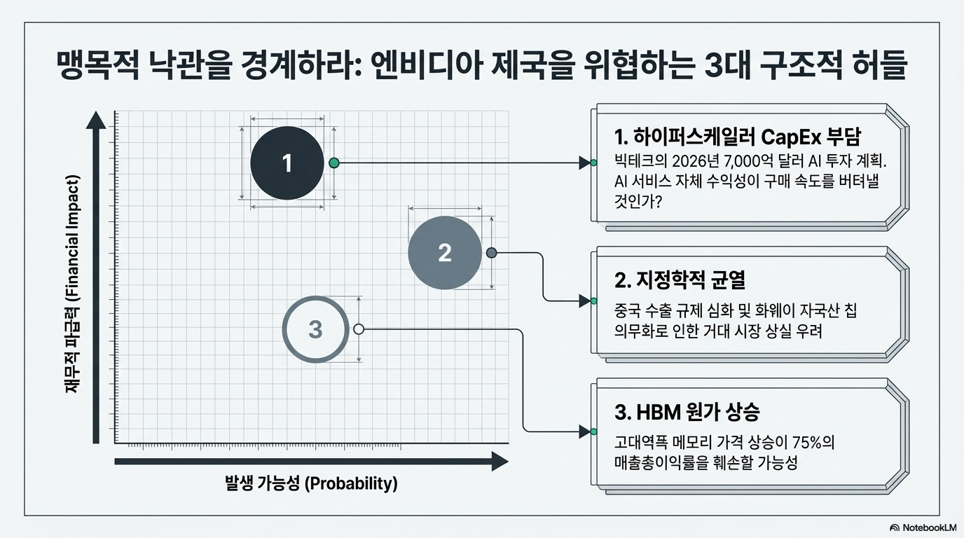 강력한 성장세에도 불구하고 엔비디아 가 직면한 리스크는 결코 가볍지 않은 상황임. 마이크로소프트, 아마존, 메타 같은 큰 손들이 2026년에만 약 7,000억 달러라는 막대한 자금을 AI에 투자할 계획이지만, 이들의 현금흐름이 이를 계속 버텨줄 수 있을지가 관건임. 만약 AI 서비스에서 충분한 수익이 나지 않아 이들이 구매 속도를 조절한다면 엔비디아의 실적 성장세도 꺾일 위험이 있음.
