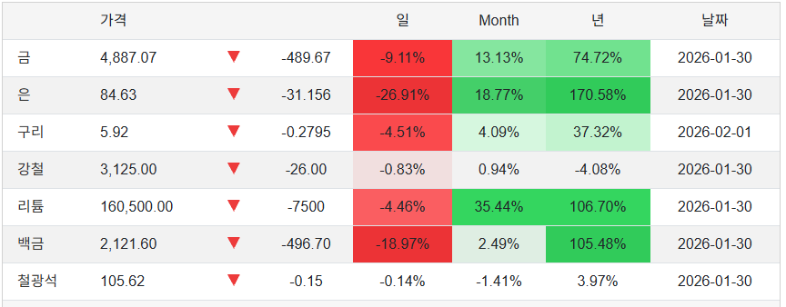 연준의장에 케빈 워시가 지명되면서 시장에서는 과거 매파적인 성향에 우려-> 금,은 등 귀금속 가격 폭락