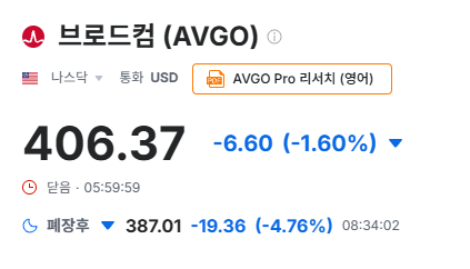 브로드컴은 실적 발표 이후 3%가량 상승 했다 하락 전환하며 5~6% 하락 중 -> 국장 전일도