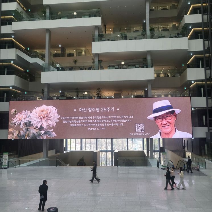 "창업자님께서 보여주신 개척의 용기와 책임의 무게를 기억합니다. 감사합니다." 20일 경기도 판교에 위치한 HD현대 사옥에 설치된 LED 화면은 고(故) 정주영 창업자를 기리는 메시지로 가득 차 있었다. HD현대 임직원들이 직접 보낸 메시지였다. HD현대는 정주영 명예회장 서거 25주기를 맞아 온라인 추모 페이지를 통해 메시지를 남기면 사옥 5층 청운홀에서 스크린으로 함께 볼 수 있는 공간을 마련했다. HD현대에 따르면 수백