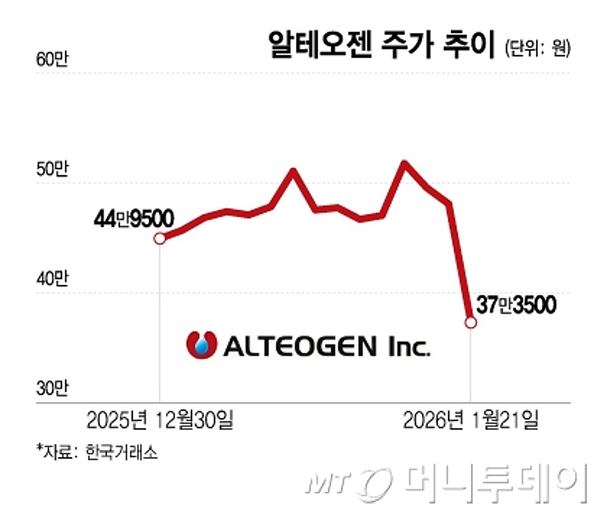 키트루다 SC 계약 세부조건 공개도 악영향 알테오젠의 주가가 21일 22% 폭락했다. 글로벌 제약사 GSK의 자회사인 테사로와 기술이전 계약을 체결했지만, 계약 규모가 시장의 기대에 미치지 못했기 때문이다. 이날 한국거래소 증시에서 알테오젠은 전날 대비 10만7500원(22.35%) 내린 37만3500원에 거래를 마쳤다. 알테오젠은 전날 테사로와 하이브로자임 기술이 적용된 'ALT-B4'를 활용한 도스탈리맙의 피하주사(SC) 제형 개발·상업화를 위한 독점 라이선스 계약을 체결했다고 발표했다. 계약에 따르면 알테오젠은 계약금 2000만달러(약 295억원)를 수령할 예정이다. 개발, 허가 및 매출 관련 주요 마일스톤 달성 시 2억6500만달러 (약 3905억원)의 마일스톤을 받을 수 있다. 최대 수취할 수 있는 총 금액은 계약금과 1개 제품 마일스톤을 포함해 약 4200억원 규모다. 상업화 이후에는 제품 매출에 따른 로열티를 수령하게 된다....