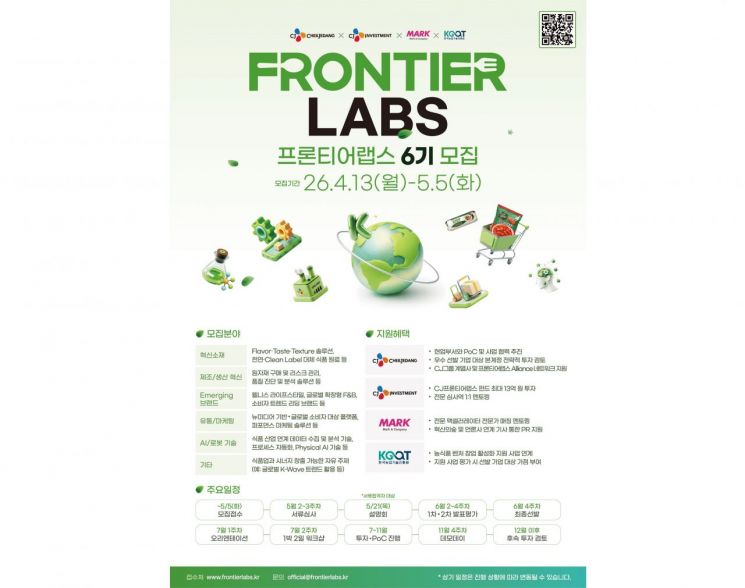 CJ제일제당이 식품 산업의 미래를 선도할 유망 푸드테크 스타트업 육성에 나선다.CJ제일제당이 오픈 이노베이션 프로그램 ‘프론티어랩스(FRONTIER LABS) 6기’를 모집한다고 14일 밝혔다. ‘프론티어랩스’는 CJ제일제당과 협업 가능한 혁신적인 기술과 아이디어를 보유한 농식품 분야 스타트업을 발굴해 투자하고 육성하는 프로그램이다.모집 분야는 ▲식품 연계 AI∙로봇 기술 ▲차세대 K-푸드 이머징(Emerging) 브랜드 ▲식품 유통∙마케팅 플랫폼 ▲스마트 제조 및 생산 혁신 ▲대체 식품