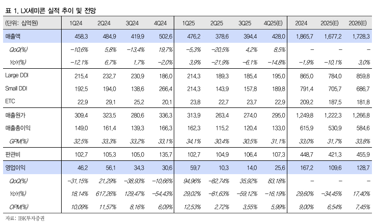 IBK투자증권은 LX세미콘에 대해 4분기에도 어려운 상황이 지속될 것으로 보고 매수 투자의견은 유지하되 목표주가는 6만7000원으로 하향한다고 10일 밝혔다. 기존 목표가는 7만8000원. LX세미콘의 3분기 매출액은 전년동기대비 6.1% 감소한 3944억원, 영업이익은 59.1% 줄어든 140억원을 기록했다. 모바일을 제외한 전 제품이 전년동기대비 역성장했고, TV용 제품 매출액은 전년동기대비 24% 감소한 986억원으로 집계됐다. 모바일 부문 매출액은 iPhone17시리즈 판매 호조로 같은 기간 14% 성장했다. 강 연구원은 LX세미콘의 4분기 매출액은 전년동기대비 14.8% 감소한 4280억원, 영업이익은 16.2% 줄어든 256억원을 기록할 것으로 추정했다....