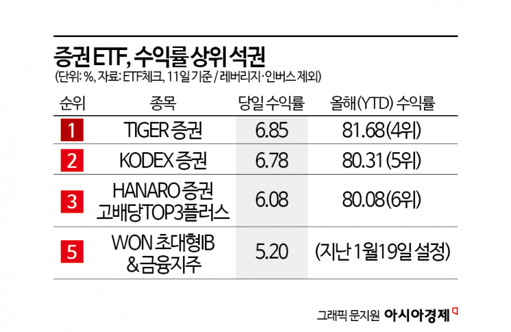 λ§κ° μκΆνλ€. 1μμΈ 'TIGER μ¦κΆ'μ μ΄λ 6.85% μ¬λκ³ 2μ 'KODEX μ¦κΆ'μ 6.78%, 3μ 'HANARO μ¦κΆκ³ λ°°λΉTOP3νλ¬μ€'λ 6.08%, 5μ 'WON μ΄λ