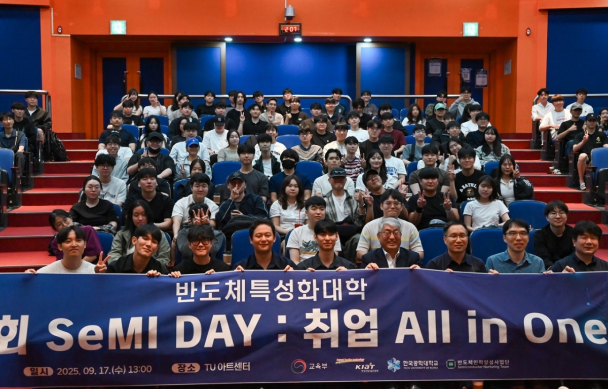 한국공학대학교 반도체인력양성사업단이 지난 17일 교내 TU아트센터에서 '반도체특성화대학 제2회 SeMI DAY: 취업 All in One'(세미데이)을 개최했다고 18일 밝혔다. 이날 행사는 교육부와 한국산업기술진흥원이 주관하는 '첨단산업 반도체특성화대학 지원사업'의 일환으로 마련됐다. 반도체 산업계로의 진출을 꿈꾸는 재학생의 취업 역량을 강화하고 현장 경험을 제공하는 것이 목표다. 삼성전자와 파크시스템스, 스태츠칩팩코리아, 싸이머코리아 등에 취업한 졸업생 선배들이 참여해 실시간 질의응답 토크콘서트를 열었다. 이들은 취업 과정의...