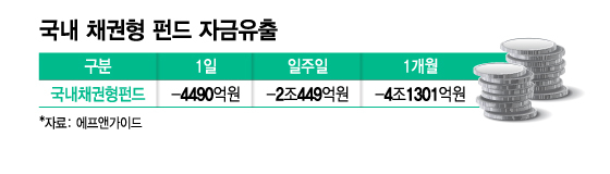 국내 채권형 펀드에서 한 달 새 4조원 이상 빠져나갔다. 국고채 금리급등으로 채권형 펀드 수익률이 약화한 탓이다. 반면 국내외 증시가 상승세를 이어가면서 채권형에서 주식형 펀드로 옮겨가는 머니무브도 일어나고 있다. 16일 에프앤가이드에 따르면 국내 채권형 펀드에서 지난 14일 기준 1개월간 4조1301억원이 순유출됐다. 지난 1주일 동안에도 2조449억원이 빠져나갔다. 반면 국내 주식형 펀드에는 5조12억원이 순유입됐다. 국내 채권형 펀드에서 자금이 빠져나간 것은 최근 국고채 금리가 오르면서 펀드수익률이 낮아졌기 때문이다. 3년물 금리는 지난 12일 심리적 상단인 2.9%를 넘긴 후 계속 상승세다. 금융투자협회에 따르면 14일 국고채 3년물 금리는 연 2.944%를 기록했다. 한 달 새 3년물 금리는 41.1bp(1bp=0.01%포인트) 올랐다. 같은 기간에 5년물과 10년물 금리도 각각 47.7bp와 44.6bp 뛰었다. 원/달러 환율상승으로 금융안정 우려가 커지고 기준금리 인하...