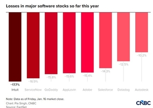 수년간 뉴욕 증시를 주도했던 미국의 대형 소프트웨어 기업들이 '혁신가의 딜레마(Innovator's Dilemma)'에 빠졌다는 지적이 제기되고 있다.이들이 도입하려던 인공지능(AI) 기술이 오히려 자사의 핵심 수익 모델을 파괴할 것이라는 공포가 확산하면서 주가가 곤두박질치고 있기 때문이다.20일(미국 현지시각) CNBC에 따르면, 올해 들어 스탠더드 앤드 푸어스(S&P) 500 지수 내에서 가장 성적이 저조한 종목은 인튜이트(NAS:INTU), 서비스나우(NYS:NOW), 고대디(NYS:GDDY), 앱러빈(NAS:APP), 어도